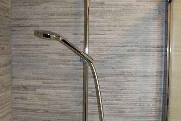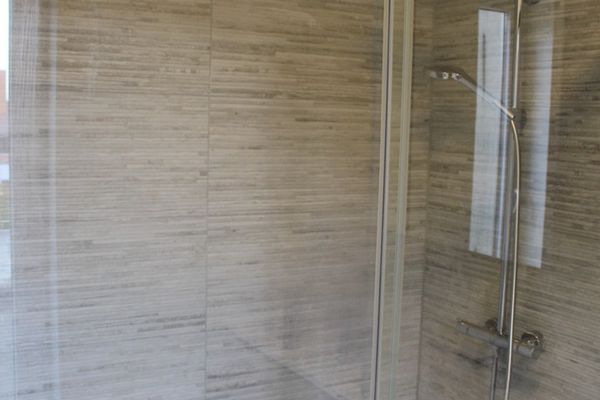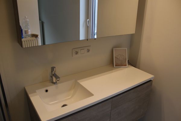 Er is een badkamer met lavabomeubel en inloopdouche.
