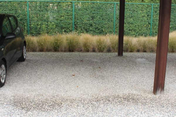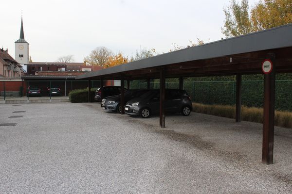 Aan de achterzijde van het gebouw kunt u uw wagen parkeren onder uw eigen carport, die in de prijs is inbegrepen.