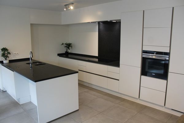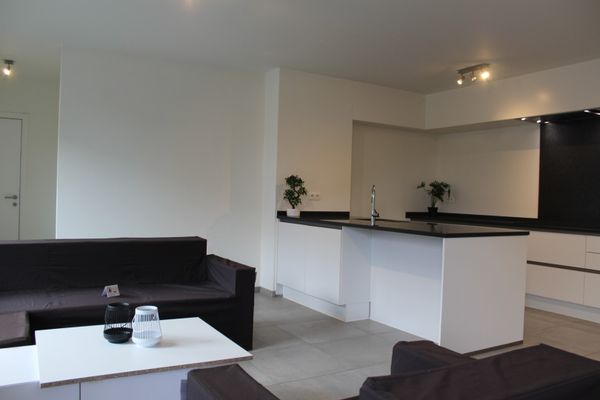 De leefruimte met open keuken voelt nog nieuw aan. Het keukeneiland heeft een blad in natuursteen