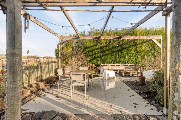 Buiten: mooi aangelegde tuin met uitzicht over de velden, terrassen voor- en achteraan, ruime garage.