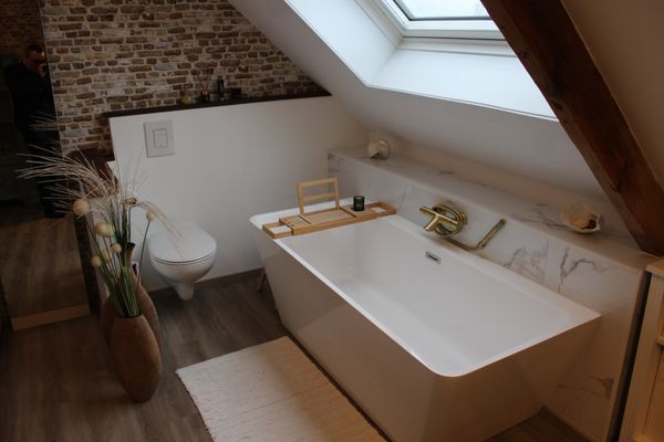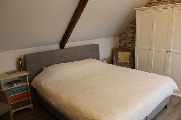Op de tweede verdieping is de grootste slaapkamer die heel luxueus aandoet met als extra een vrijstaande badkuip en een toilet.