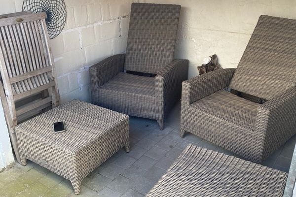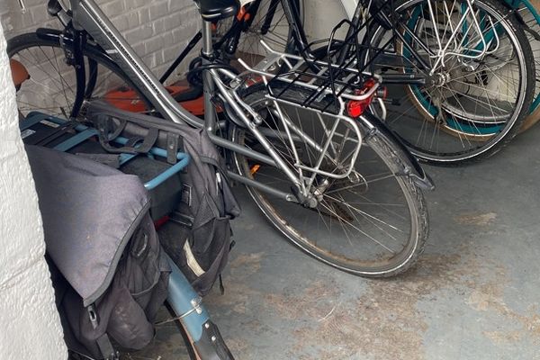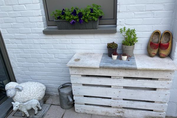 Er is een terras en een kleine achtertuin met een grote berging voor fietsen en tuinmateriaal.